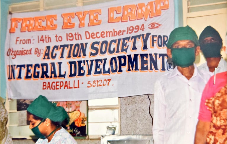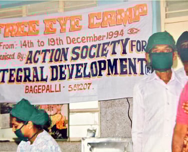 Eye checkup camps offering free screenings and spectacles, with major cases referred for advanced treatment.